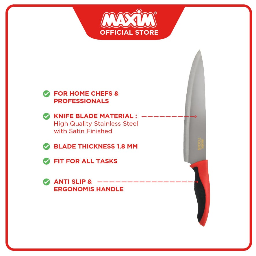 Maxim 6 (SF) Chef Knife adalah representasi nyata dari komitmen Maxim Indonesia terhadap kualitas. Pisau ini dibuat dari material baja tahan karat, khususnya Stainless Steel 420, yang dikenal akan ketahanan dan kemampuannya menjaga ketajaman. Dengan panjang mata pisau sekitar 15 cm (atau 6 inci) dan lebar 4 cm, bilahnya dirancang lebih panjang dan lebar, dilengkapi ujung runcing yang multifungsi. Ketebalan mata pisaunya sendiri adalah 1.8mm, menawarkan keseimbangan antara kekuatan dan presisi saat memotong.