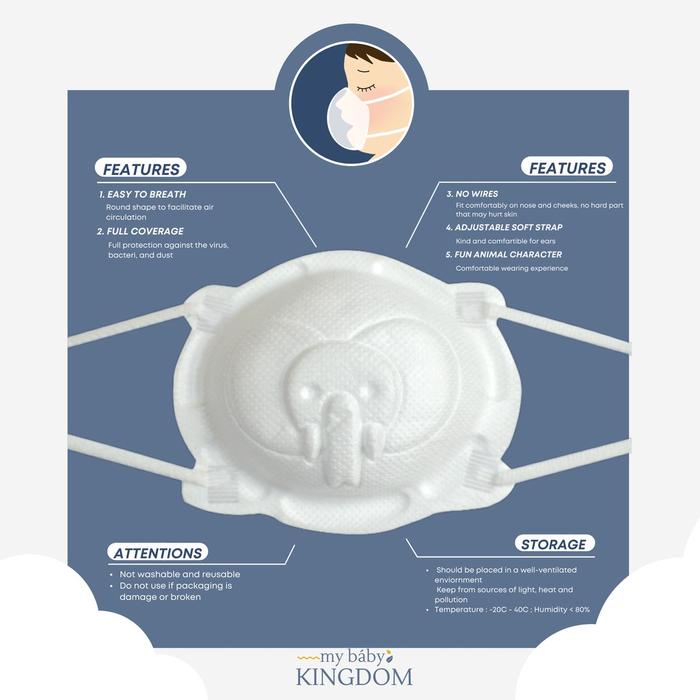 My Baby Kingdom 3D+ KF94 4 Ply Mask adalah pilihan yang sangat kami rekomendasikan bagi Anda yang mencari masker anak yang tidak hanya efektif dalam perlindungan, tetapi juga menarik perhatian si kecil. Dengan desain karakter hewan yang lucu, kenyamanan superior berkat bentuk 3D dan earloop yang lembut, serta lapisan filtrasi 4 ply yang teruji, masker ini berhasil menciptakan kombinasi sempurna antara keamanan dan daya tarik bagi anak-anak. Jika Anda sering kesulitan membujuk anak memakai masker, produk ini bisa menjadi solusi jitu Anda. Kami memberikan rating 4.5/5 untuk inovasinya dalam membuat perlindungan kesehatan menjadi hal yang menyenangkan bagi anak.