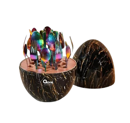 Ketika set alat makan dikeluarkan dari "cangkang" telurnya, warna-warni pelangi pada setiap sendok, garpu, dan pisau langsung menarik perhatian. Warna rainbow ini memberikan sentuhan modern dan ceria, jauh dari kesan kaku yang sering ditemui pada alat makan konvensional. Meski tampilannya mewah, setiap potong alat makan dirancang dengan desain ergonomis, sehingga sangat nyaman digenggam dan digunakan. Beratnya pas, tidak terlalu ringan sehingga terasa ringkih, juga tidak terlalu berat yang bisa membuat tangan cepat pegal. Menggunakan set ini untuk jamuan makan malam atau sekadar makan sehari-hari membuat momen bersantap terasa lebih istimewa dan penuh gaya.