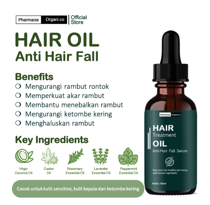 Pharmacie Organi.Co Hair Treatment Oil Anti-Hair Fall Serum merupakan produk dari brand Aroma Sehat Nusantara yang diformulasikan khusus untuk mengatasi masalah rambut rontok dan ketombe. Keunggulan utama serum ini terletak pada kombinasi minyak esensial yang kuat dan terbukti secara ilmiah. Kandungan utamanya meliputi minyak rosemary, lavender, peppermint, serta diperkaya dengan castor oil dan virgin coconut oil. Produk ini juga telah mendapatkan sertifikasi Halal LPPOM MUI, memberikan ketenangan tambahan bagi pengguna muslim.