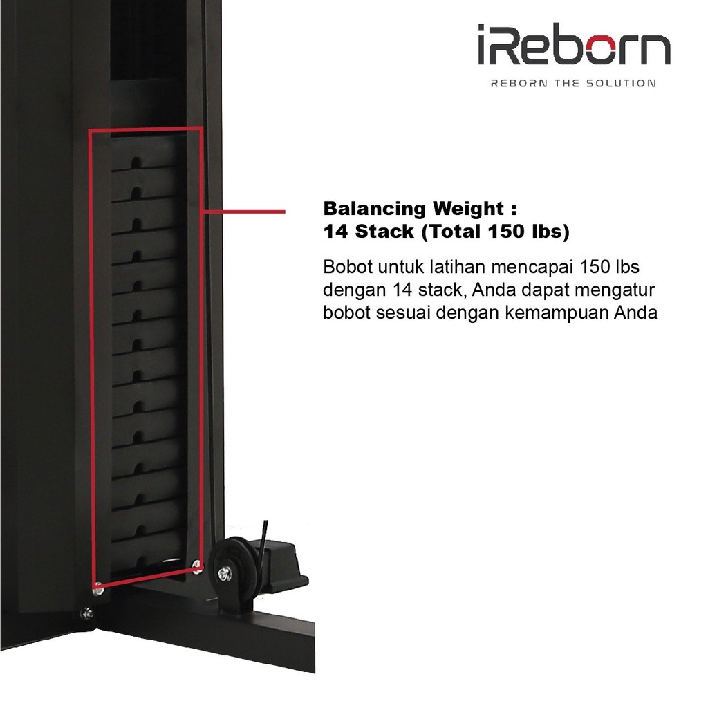 Salah satu inti dari iReborn Metro Home Gym adalah sistem beban yang digunakannya. Alat ini dilengkapi dengan 14 keping weight stack atau setara dengan beban seimbang 150 LBS. Jumlah weight stack ini memungkinkan pengguna untuk menyesuaikan intensitas latihan sesuai dengan kemampuan dan progres kebugaran masing-masing. Fitur-fitur latihan yang terintegrasi dalam satu stasiun ini meliputi Lat Pulldown untuk otot punggung dan trisep, Butterfly untuk otot dada, Bicep Bearings sebagai tatakan untuk latihan bisep, Leg Curl untuk otot paha, dan Rowing Bicep untuk melatih bisep. Tambahan Chest Press juga hadir untuk melengkapi latihan otot dada. Desainnya yang satu stasiun memastikan semua fungsi ini terintegrasi dengan baik, memberikan pengalaman latihan yang terstruktur dan aman.