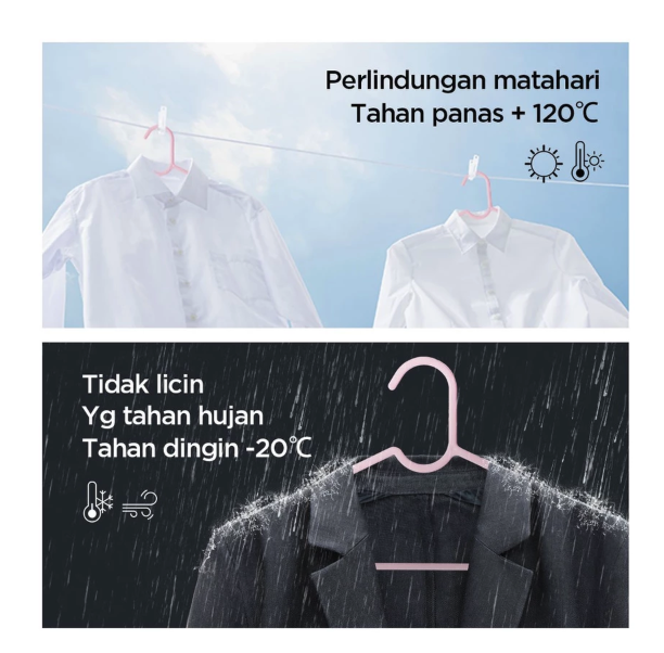 - Tahan Cuaca: Dengan kemampuan "untuk basah dan kering", gantungan ini ideal untuk menjemur pakaian di luar ruangan, baik saat panas maupun sedikit gerimis, tanpa khawatir cepat rusak.